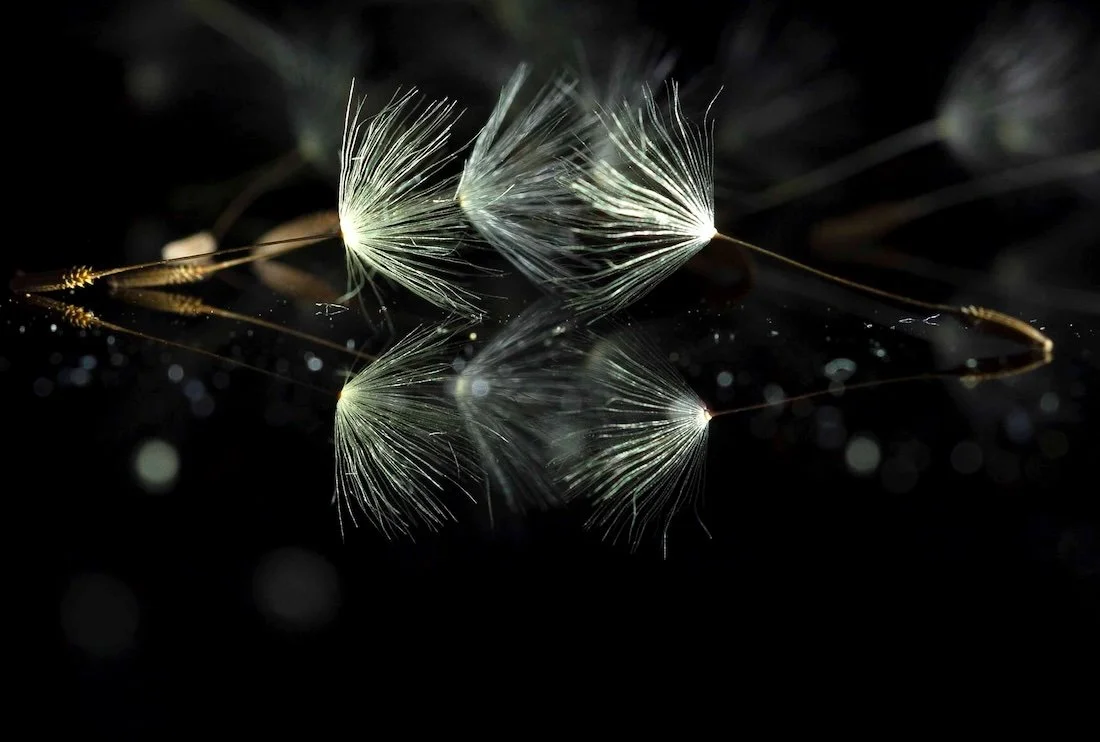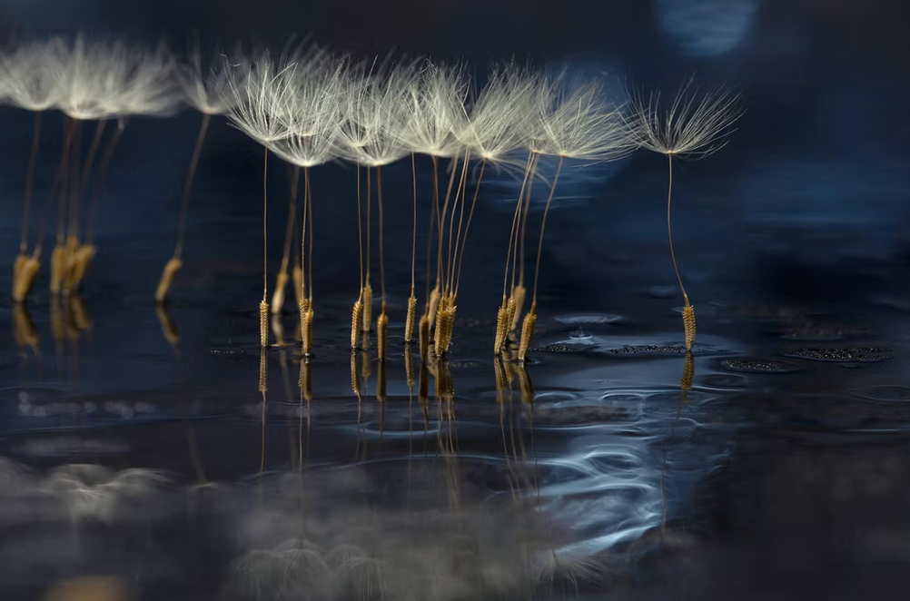 “The graceful ballerina seeds of the dandelion dance across the top of the glistening, serene water below. The play of shadows adds great depth to the image.”